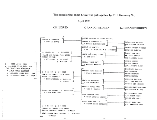 I have done a little research and over the next several blogs I am going to give each of you a short bio and contact information for each of the 24 Great-Grandchildren of Elmer and Madelena Guernsey. Below you will see a chart that helps you navigate the families.