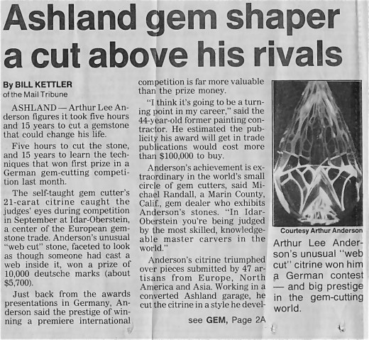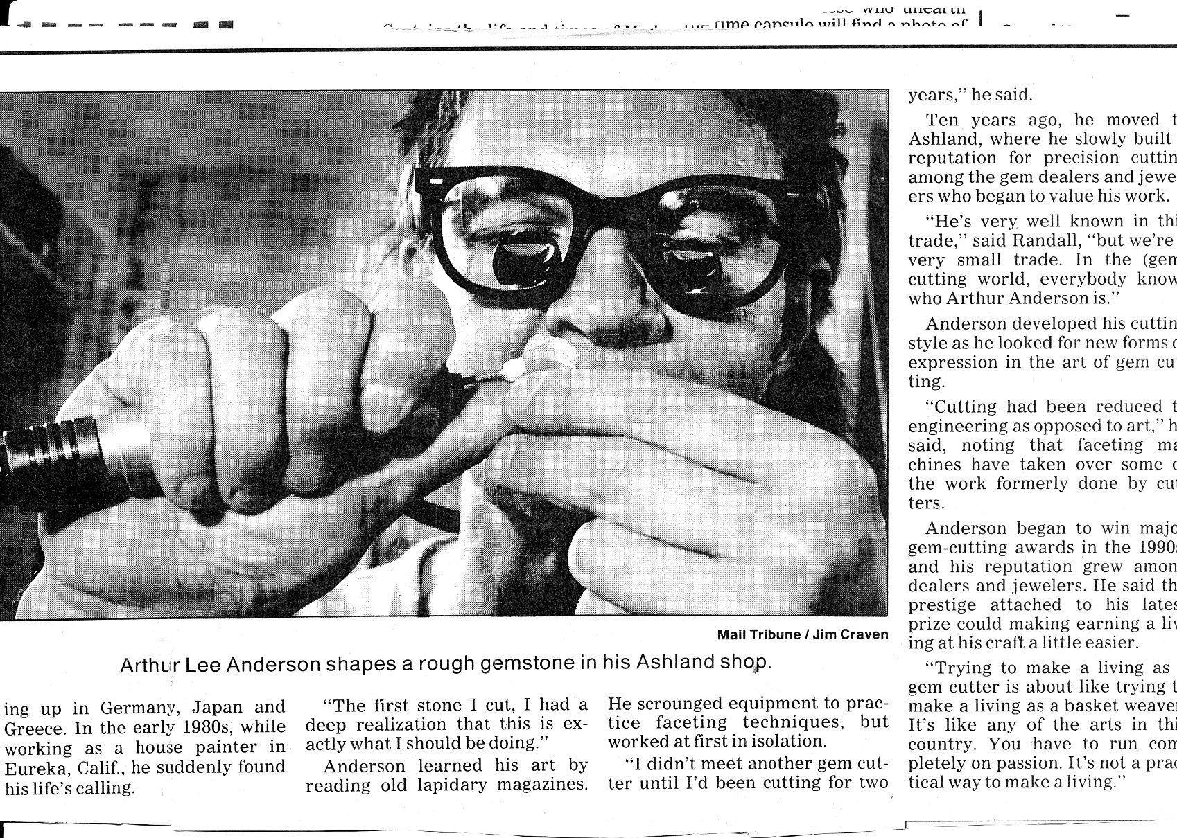 ARTHUR LEE ANDERSON (Marjorie, Alida, Elmer) lives in Portland Oregon. Art is an award winning Lapidary and Gemologist. Art Lee is retired, his company’s name was Speria Gems. His work has been featured in GEMS AND GEMOLOGY MAGAZINE and the LAPIDARY JOURNAL. A number of years ago he won first prize of 10,000 deutsche mark in a German gem-cutting competition (see the attached picture). My favorite quote from Arthur is “I used to have this fantasy of walking into a Beverly Hills party and seeing one of my stones hanging on the neck of some glamorous woman, now my fantasy is to se it on the finger of a waitress in a greasy spoon in Arkansas, set in a little $30 ring, that means allot to her.” Art’s daughter Tanya is a student living in Bend, Oregon.