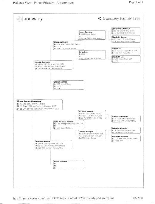 The charts actually goes on many generations past the sheet I have enclosed. Example, John Garnzey, born 1561 in England (no I did not mis-spell the Guernsey name, it later changed to Garnsey in Massachusetts and later to Guernsey.) Madalena M. Honderick’s chart can be traced back to Ruprecht VonD Ren born in 1226 in Germany, married to VonHolhenlohe Branuneck of Germany.