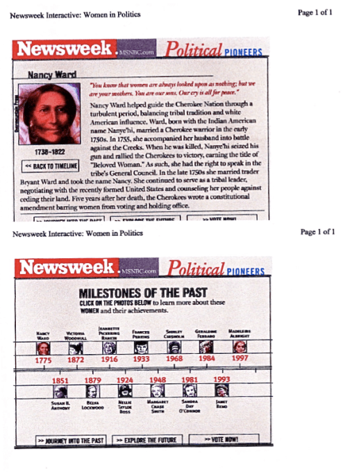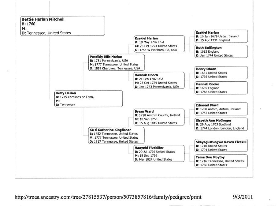 Now here is where the fun starts. IF we can prove that our Bettie Harlan is the granddaughter of the very famous Nancy Nanye Ward, we will have some real bragging rights. Records show the famous Nanye had a granddaughter named Bettie Harlan, however some Ancestry.com trees show she had two granddaughters named Bettie Harlan. Peter Hildebrand who married one of the Bettie Harlan’s, in a sworn statement said his wife had a sister named Bettie Harlan that lived in the old Cherokee Nation East and never moved to the west. That is the Bettie Harlan Mitchell I believe married Henry Anderson around 1780. The NEWSWEEK article list Nancy Nanye Ward as one of the 13 Political Pioneer Milestones of the Past! She had the status equal to that of a Cherokee Chief. I am not ready to say our relationship to Nanye is a fact, but it makes interesting research and I will keep trying.