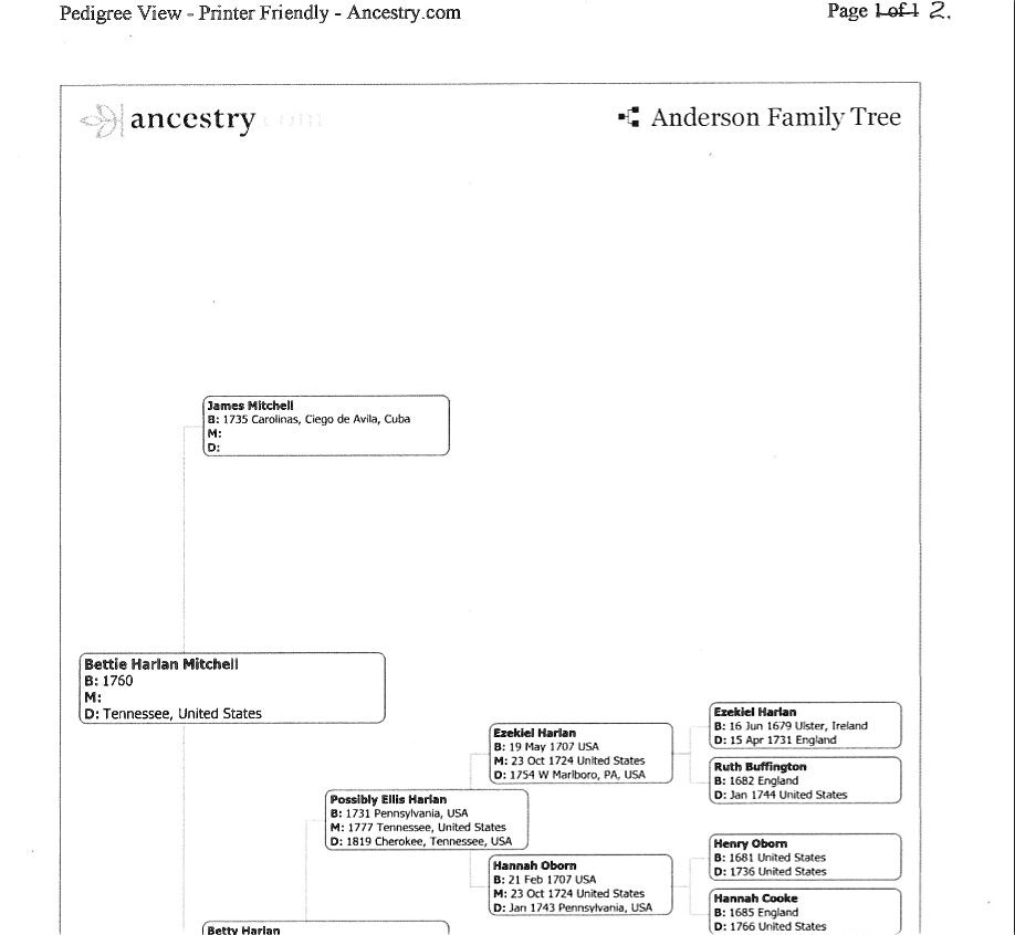 You will note granddad’s great, great great-grandmother was Elizabeth “Betty” Harlan Mitchell. She is one of the Anderson links to the Cherokees. I have reason to believe that our grandmothers Fannie Griffin, born 1770 and Nancy A. Wilson born 1846, were part Native American , but yet to be proved.
