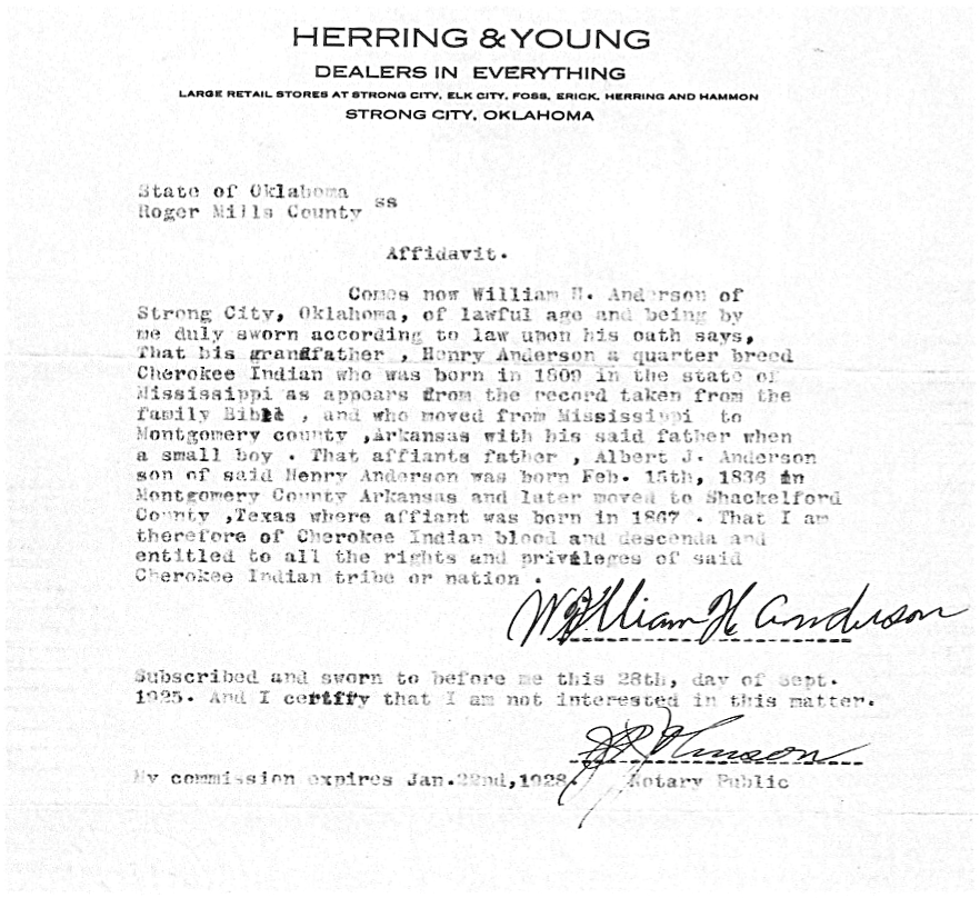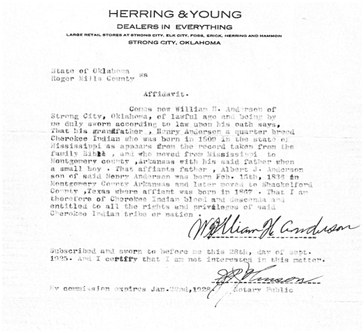 For reasons I do not know, granddad made an affidavit again in 1925 stating that his grandfather Henry M. Anderson was a quarter breed Cherokee Indian. Henry M. would be a grandson of Henry Anderson who married Bettie Harlan Mitchell.