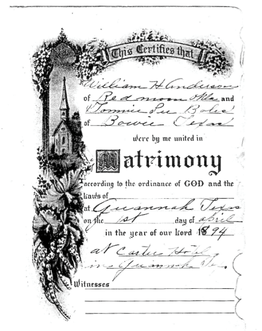 After a three-year courtship, mostly by mail, Tommie roped her cowboy boyfriend Black Bill Anderson. They were married in Quanah Texas on April 1, 1894.
