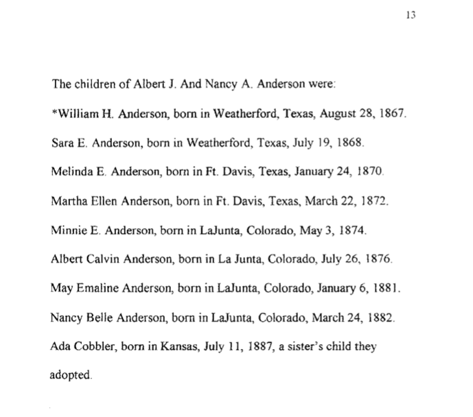 Albert and Nancy’s first child, (our grandfather), William Henry Anderson, was born in Weatherford, Texas, on August 28, 1867. His sister Sarah E. Anderson was also born in Weatherford in 1868. Nancy lived in Fort Davis but I believe she went to Weatherford as there were no doctors at the fort. Their next two girls Martha and Ellen were born at Fort Davis.