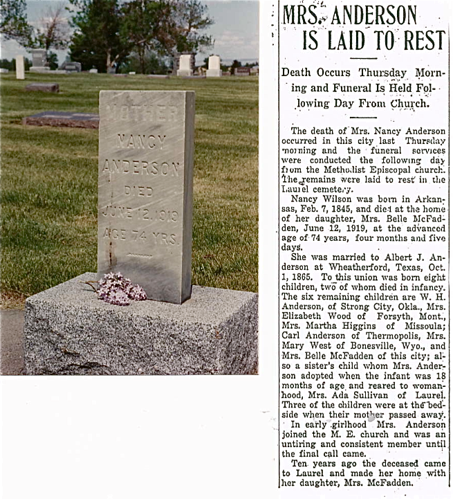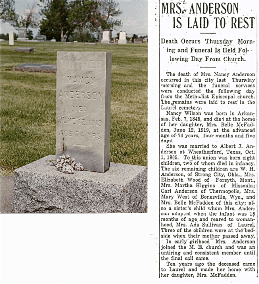 Thanks to Elsie  Johnston’s book,  Laurel’s Story, A Montana Heritage and a newspaper clipping we learn a little more about Nancy’s life after Albert’s death.  Their daughter, Nancy Belle Anderson had married Burt Woodward and lived in Forsyth, Montana.  After Burt  died she and her two-year old son moved to Laurel to join her mother Nancy.