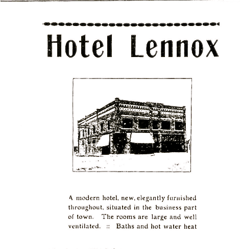 Together they operated the Yellowstone Hotel, that was a frame building.  In the book they also “operated the Lennox Hotel for many years”.  They took over the Lenox from H.W. Higgins who left Laurel in 1909.