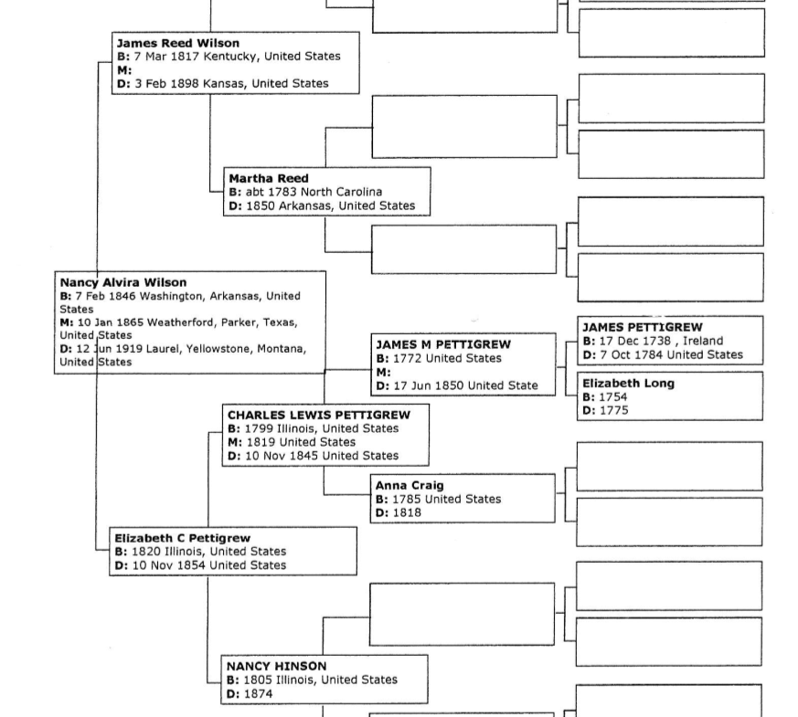 We have covered the life of Albert J. Anderson and now lets learn more about his wife, Nancy Alveria Wilson.  She was born February 7, 1846, in Washington County, Arkansas. Her parents were James Reed Wilson and Elizabeth C. Pettigrew.  Her mother passed away when Nancy was 8 years old.  The 1860 census indicates that James had moved his family to Palo Pinto, Texas, and  James had a new wife, Nancy Hughes.