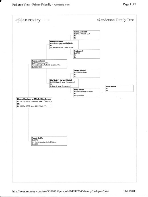 Also included is a family tree to help you follow the relationship of Henry M. Anderson to the Cherokee Indian, Bettie Harlan Mitchell.   There is a possibility that Henry M.’s mother Fannie Griffin could also have had Indian blood, but  it can not be verified.