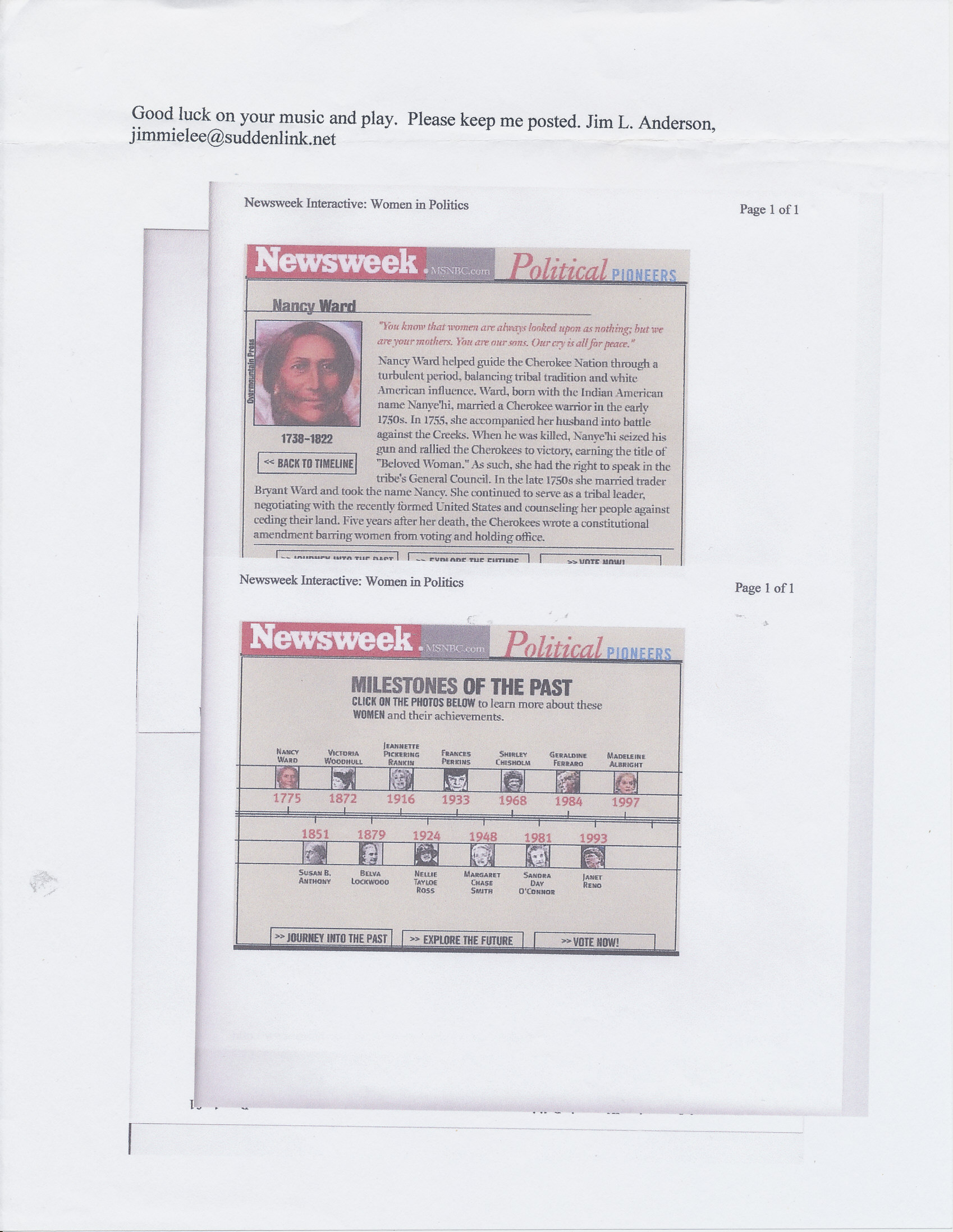 What I find most interesting is Nelson Harlan’s explanation of two sisters, both named Bettie Harlan! The one that married Peter Hilderbrand, was the granddaughter of the famous Indian, Nancy Nanye’hi Ward (see the Newsweek article). If Nelson’s affidavit is correct ,our Bettie Harlan, whose daughter married Henry Anderson, would also be a direct descendant of Nancy Ward! That would be great, but almost impossible to prove.