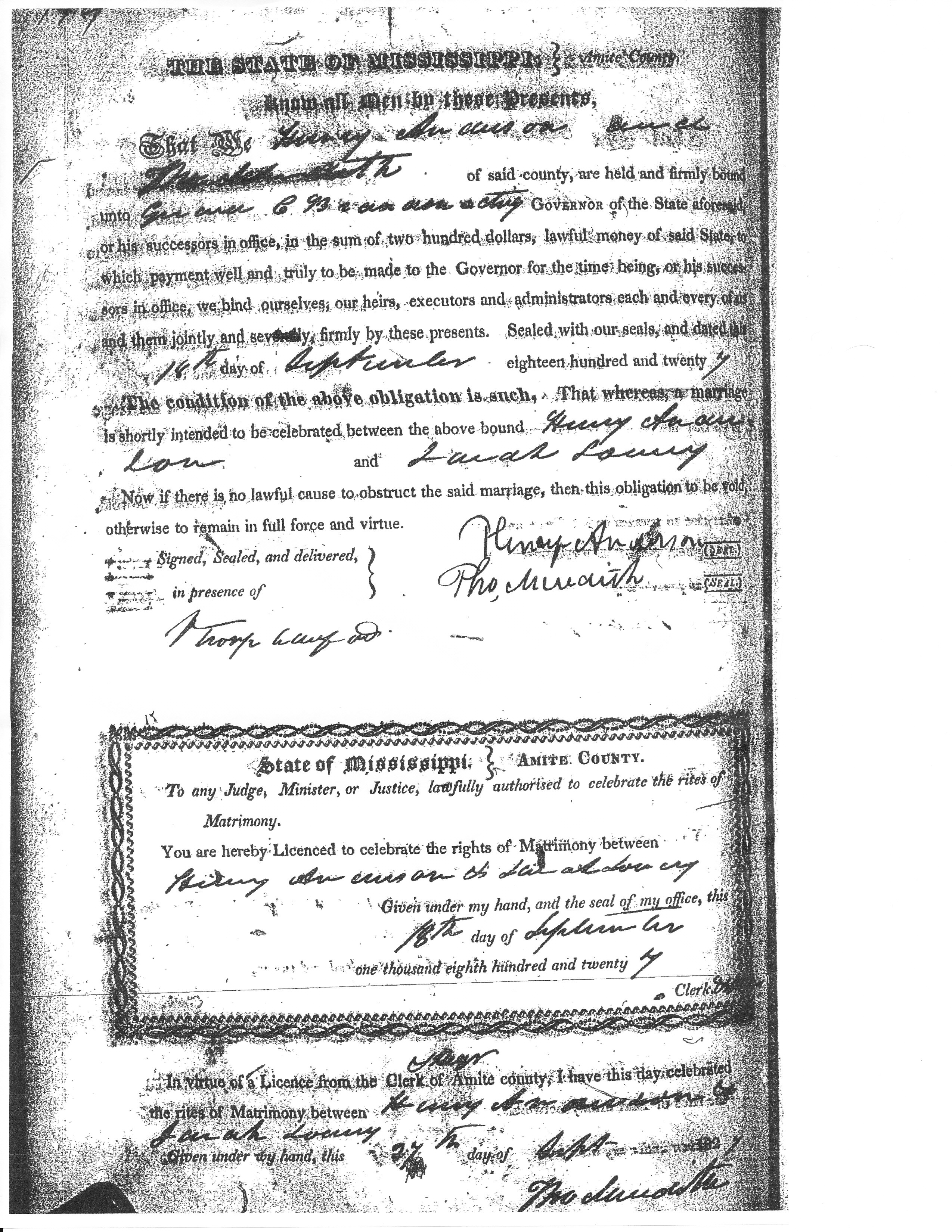 Henry M. Anderson married Sarah “Sally” Lowry on September 18, 1827 in Amite County, Mississippi. There are family debates as to whether Henry married Sarah Lowry or Sarah Collier? Good arguments on both camps, however, the only document found so far is the marriage certificate from Amite County, dated September 18, 1827, stating that Henry Anderson married Sarah Lowry.