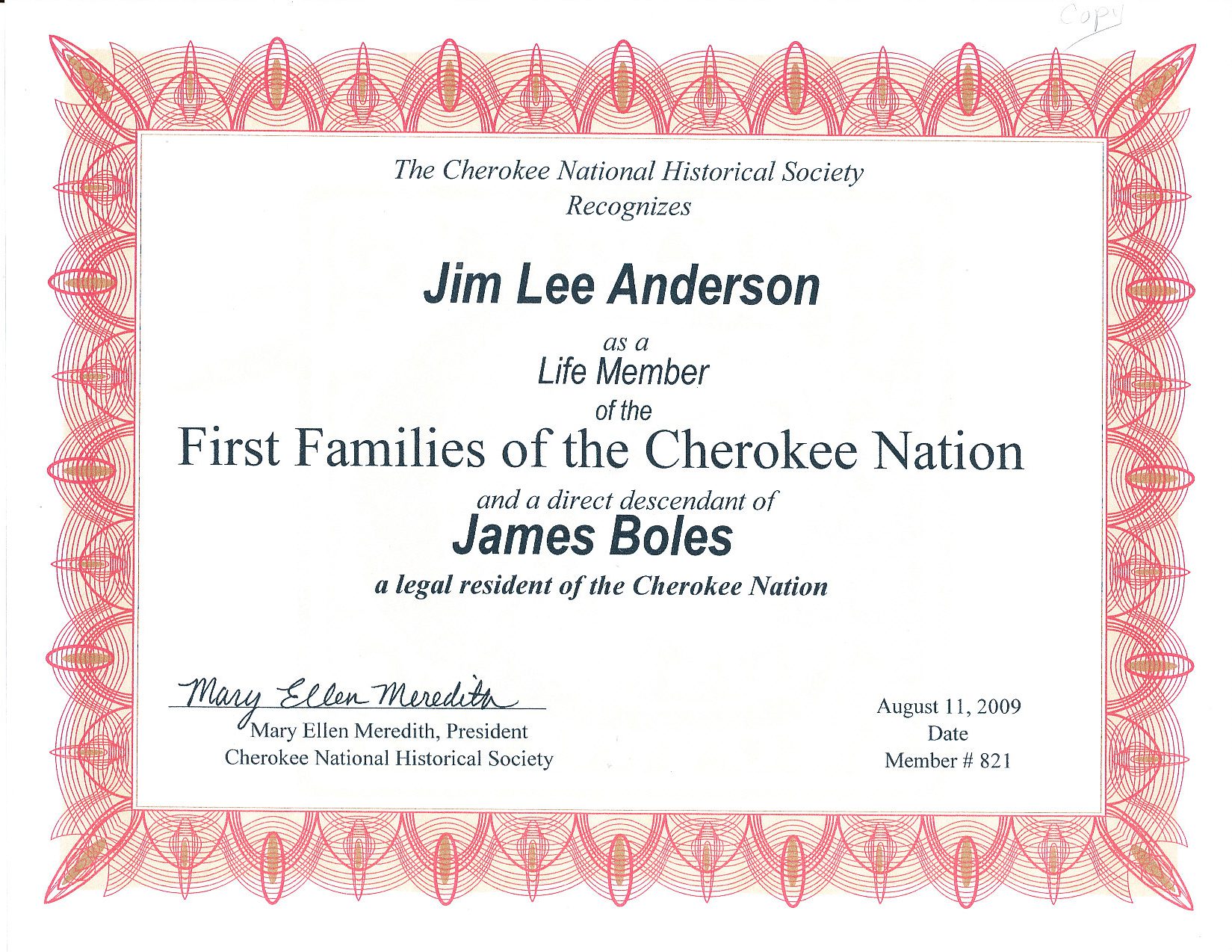 Our family’s relationship to Chief Bowles was revealed when Tommie and her father Levi made application for Cherokee Citizenship with the Dawes Commission in 1896, case #4618. There were affidavits submitted with their application confirming their Cherokee blood. One read “In the case by Levi C. Boles, age 64, he is a cousin to Johnson Boles, Lightening Bug Boles, Joe Boles and a distant relative of old Chief Boles”. Other confirming affidavits were given by Saike Splitnose and George Dreadful Water. It is my belief that our gg great grandfather, James Boles, born 1760, and Chief Bowles, born 1765, were brothers. They both said their father was a Scotch Irish trader and their mother a Cherokee. They traveled the same path after leaving South Carolina. Tommie Lee Boles always claimed she was Scotch, Irish, Indian.